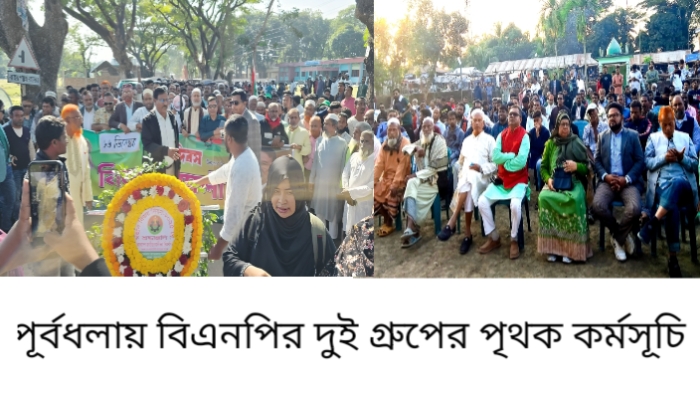এইচ রহমান : নেত্রকোনার পূর্বধলায় ঐতিহাসিক মহান বিজয় দিবসেও ঐক্য প্রদর্শনে ব্যর্থ হলো বাংলাদেশ জাতীয়তাবাদী দল (বিএনপি)। দলটি দুটি গ্রুপে বিভক্ত হয়ে পৃথকভাবে পুষ্পস্তবক অর্পণ, বিজয় র‍্যালি ও সমাবেশের আয়োজন করে।